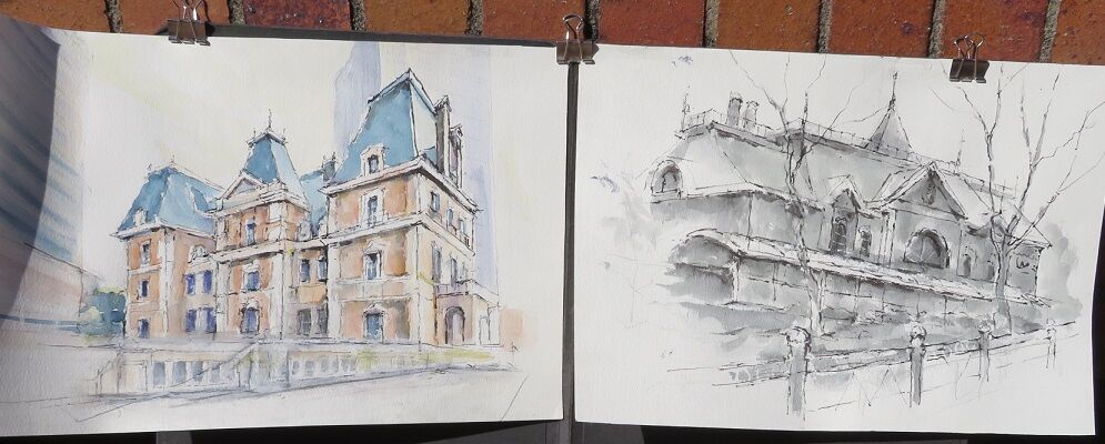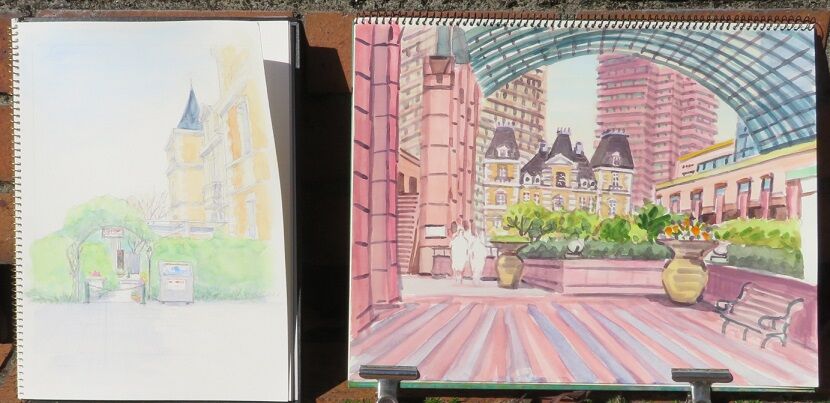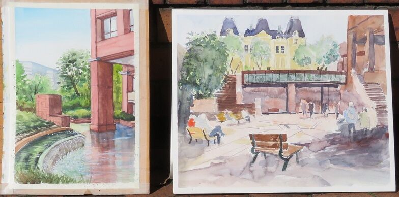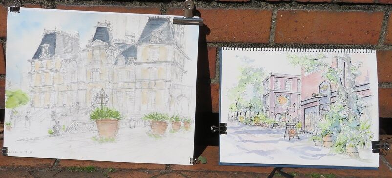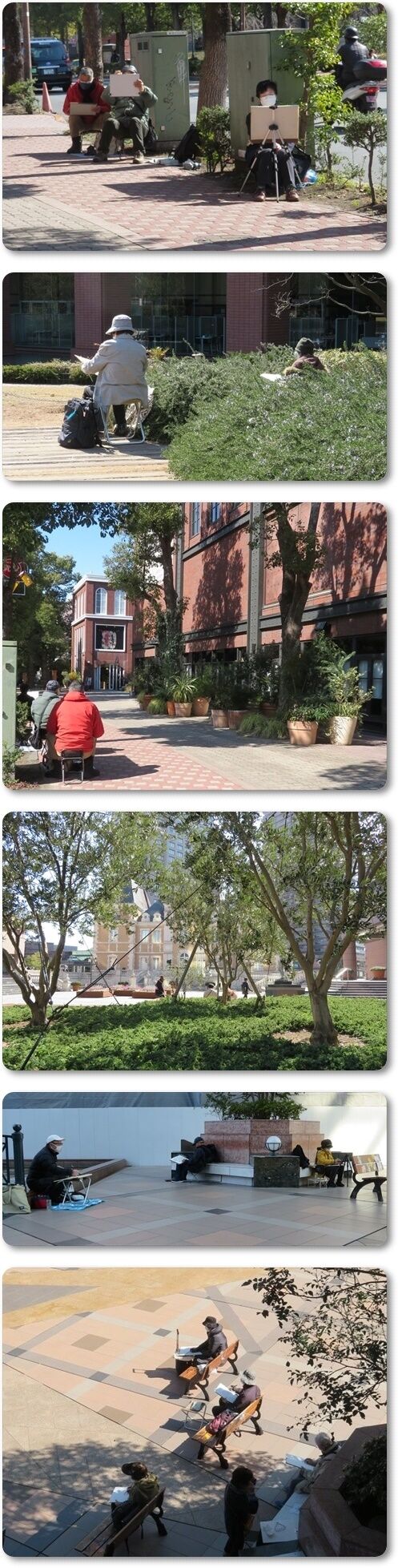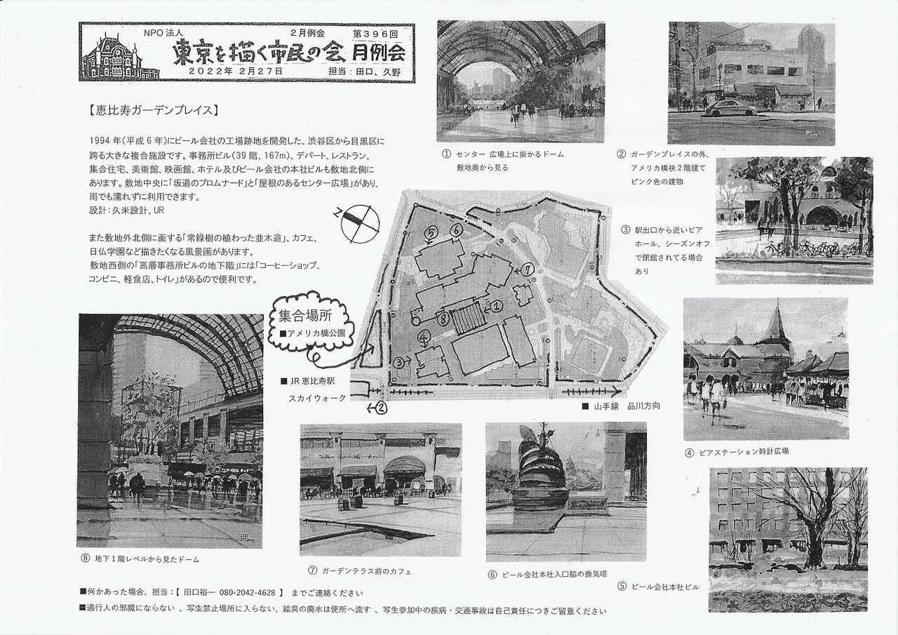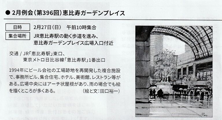 2022年02月28日 2月例会(第396回) 恵比寿ガーデンプレイス 先週末辺りからすっかり春めいて良いお日和続きで 嬉しいですね昨日の例会の様子を お当番さんがお送りくださいました (ワンクリックで 拡大してご覧になれます)昨日(2月27日)の例会は 恵比寿ガーデンプレイスで行いました。暖かく春を感じる日で 風はやや強かったですがスケッチ日和でした。 3年前の2月と比べ三越が撤退し、コロナの影響で日曜に行われるイベントもなく静かで描きやすかったです。 41名の参加者があり帰りの作品展示会は 隣接するアメリカ橋公園で14時に行いました。 担当・田口裕一 以下参加された皆様の作品です (其々の画面上でワンクリックすると 拡大してご覧になれます)