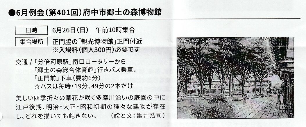 2022年06月27日 6月例会(第401回)府中市郷土の森博物館 6月の例会は26日(日)府中市郷土の森博物館で行い6月としては異常に暑いなか、37名の参加がありました。園内では あじさい祭が開催されていて多くの入園者に交じって スケッチしました。14時に 帰りの展示会を行ない 楽しい一日でした。担当:亀井、田口以下皆様の作品です博物館園内では「あじさい祭、和太鼓の演奏」が行われていて、 多くの入園者で賑わってました。以上 担当の方のご報告でした画面をこれ以上大きくして ご覧になりたい方はPC 画面右上の設定から ズームしてご覧ください皆様の作品も これでいくらでも拡大してご覧になれますよ