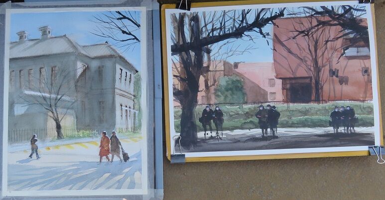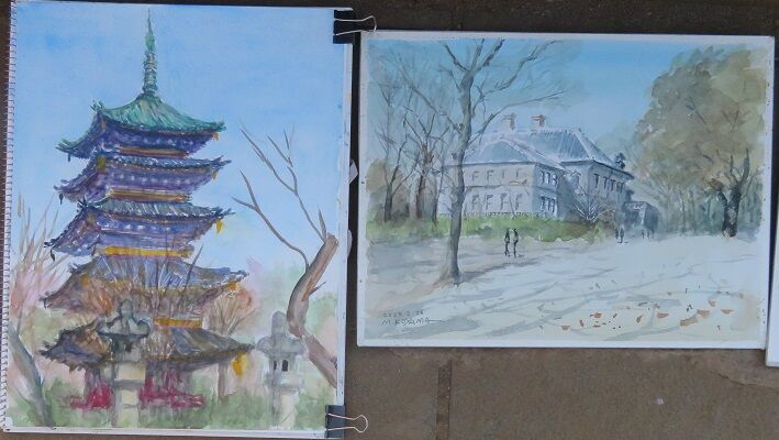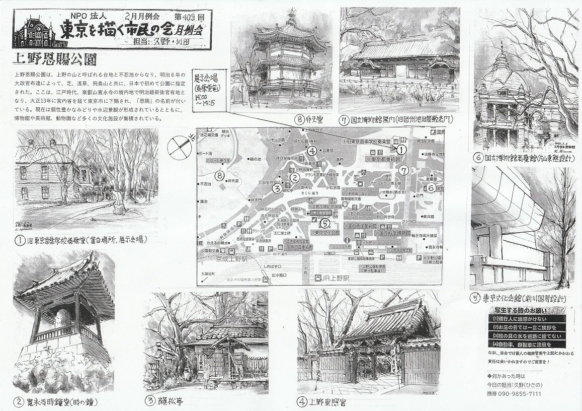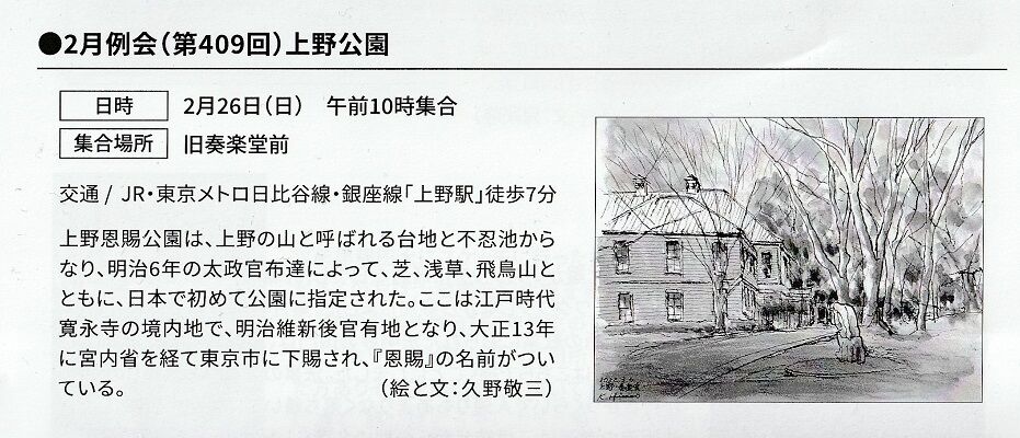 2023年02月28日 2月例会(第409回)上野公園 「本日の例会は、コロナが落ち着いて来たからか、参加者70名と大盛況でした。寒風にも負けず、皆さん頑張って描いていたので、14時の展示会はいつに無く力作ぞろいでした。」久野敬三